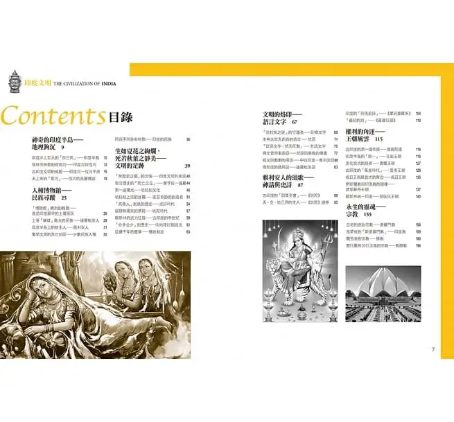 編者從印度獨特的地理環境及複雜的民族人種入手,為讀者鋪陳出古印度文明誕生的基底輪廓;繼而娓娓述說各個文明創生及衰亡的過程──哈拉帕、雅利安、伊斯蘭等,並詳及各文明的重要成就、文化遺產與其影響,尤其在宗教、神話、文學、哲學、建築方面,用力特深,一卷在手,即可神遊印度上下 5000 年的文明發展歷程。